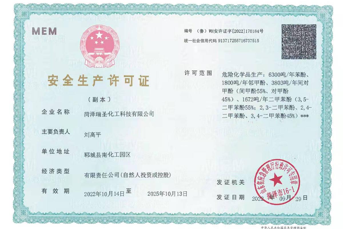 瑞圣化工資質證書展示
